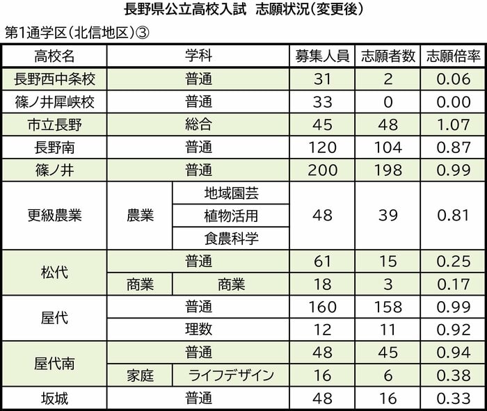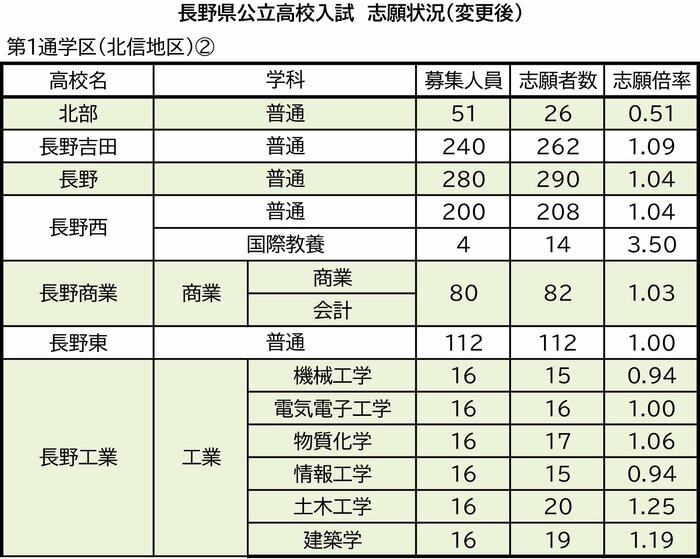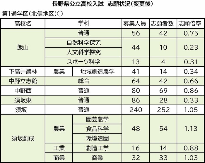 第1通学区(北信地区)の飯山、下高井農林、中野立志館、中野西、須坂東、須坂、須坂創成、北部、長野吉田、長野、長野西、長野商業、長野東、長野工業、長野西中条校、篠ノ井犀峡校、市立長野、長野南、篠ノ井、更級農業、松代、屋代、屋代南、坂城の志願状況は次の通り。