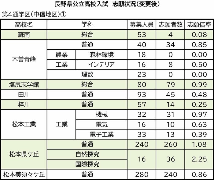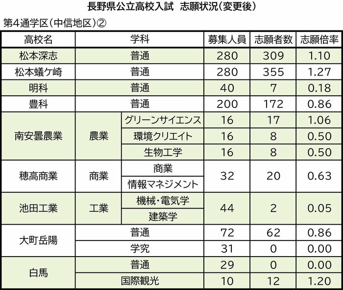 第4通学区(中信地区)の蘇南、木曽青峰、塩尻志学館、田川、梓川、松本工業、松本県ケ丘、松本美須々ケ丘、松本深志、松本蟻ケ崎、明科、豊科、南安曇農業、穂高商業、池田工業、大町岳陽、白馬の志願状況は次の通り。