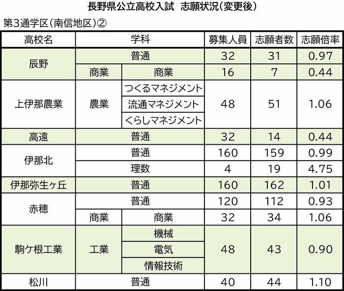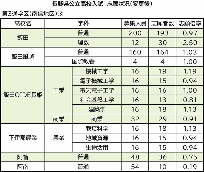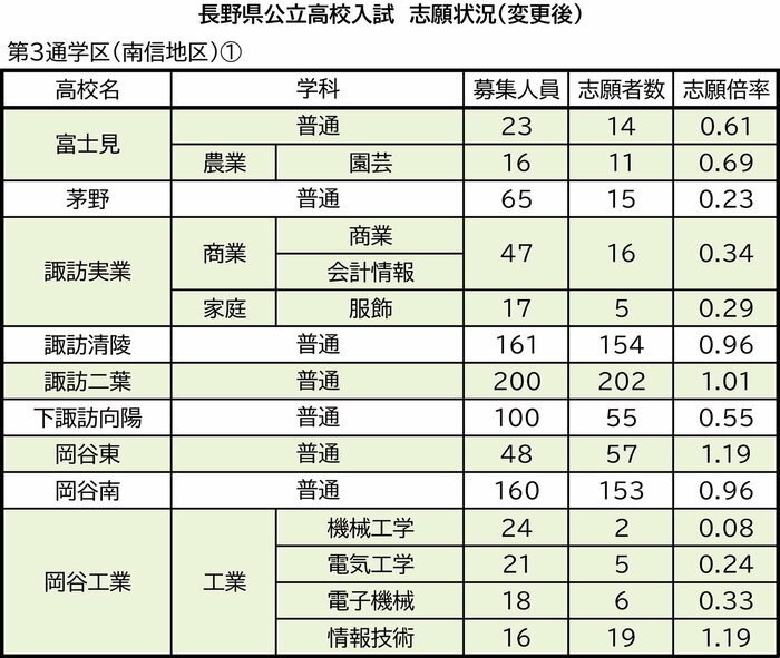 第3通学区(南信地区)の富士見、茅野、諏訪実業、諏訪清陵、諏訪二葉、下諏訪向陽、岡谷東、岡谷南、岡谷工業、辰野、上伊那農業、高遠、伊那北、伊那弥生ヶ丘、赤穂、駒ケ根工業、松川、飯田、飯田風越、飯田OIDE長姫、下伊那農業、阿智、阿南の志願状況は次の通り。