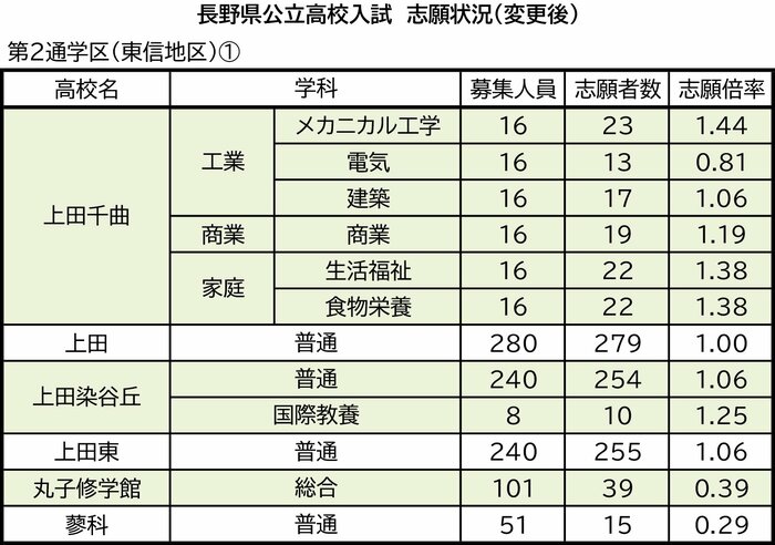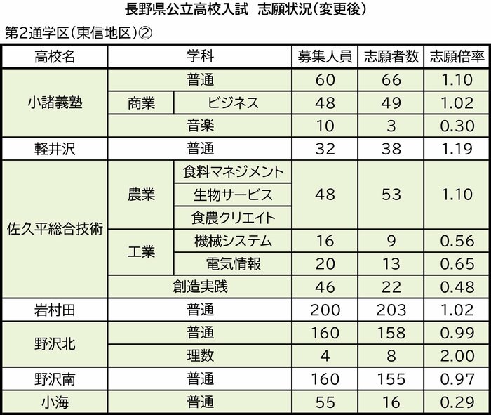 第2通学区(東信地区)の上田千曲、上田、上田染谷丘、上田東、丸子修学館、蓼科、小諸義塾、軽井沢、佐久平総合技術、岩村田、野沢北、野沢南、小海の志願状況は次の通り。