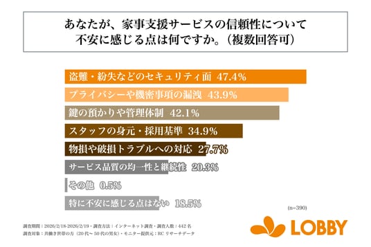 調査の最後、家事支援サービスの利用経験がない共働き世帯の方を対象に、「家事支援サービスの信頼性について不安に感じる点は何か」を尋ねる設問への回答では、1位が「盗難・紛失などのセキュリティ面」で47.4%、2位が「プライバシーや機密事項の漏洩」で43.9%、3位が「鍵の預かりや管理体制」で42.1%という結果になりました。この結果から、家事支援サービスの利用経験がない共働き世帯の方の半数近くが、家事支援サービスの信頼性について「盗難・紛失などのセキュリティ面」に不安を感じていることがわかりました。
