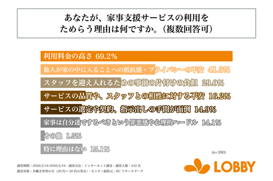 家事代行サービスを展開する株式会社ロビー(本社:東京都新宿区、代表取締役:対馬 誉仁)は、共働き世帯の方(20代~50代の男女)を対象に「家事支援サービスを利用することへの心理的障壁に関する調査」を実施しました。この調査から、共働き世帯の方が抱える家事への負担感や、家事を他人に任せることへの罪悪感、家事支援サービスの利用実態などが明らかになりました。