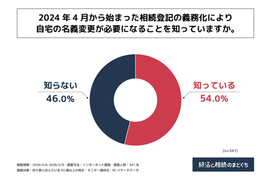 続いて、「2024年4月から始まった相続登記の義務化により自宅の名義変更が必要になることを知っているか」を尋ねる設問への回答では、「知っている」が54.0%、「知らない」が46.0%という結果になりました。この結果から、持ち家に住んでいる65歳以上の男女の半数近くが、2024年4月から始まった相続登記の義務化により自宅の名義変更が必要になることを知らないことがわかりました。