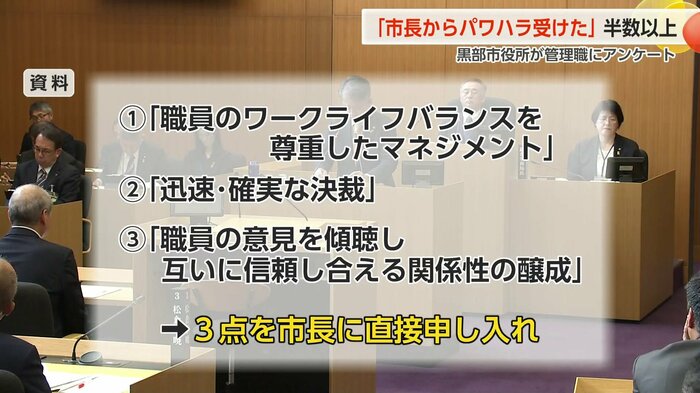 その結果を受け、担当幹部は今年2月中旬、アンケート結果を個人が特定できない形で「職員のワークライフバランスを尊重したマネジメント」「迅速・確実な決裁「職員の意見を傾聴し互いに信頼し合える関係性の醸成」の3点を市長に直接申し入れたということです。