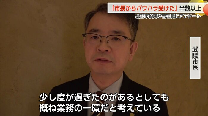 富山県黒部市役所の管理職を対象に、武隈市長のパワーハラスメントに関するアンケートが行われ、回答者の半数以上が「パワハラ行為を受けた」と答えていたことが分かりました。これに対し、武隈市長は「度が過ぎていたとしても業務の一環」としています。
