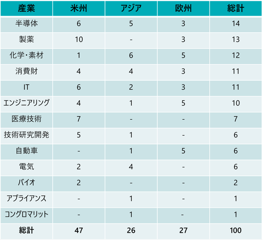 ・ 半導体が首位: 2025年は製薬が最多だった一方、2026年のTop 100では半導体が14社で最多となり、製薬(13社)、化学・素材(12社)が続きます。日本からも7社が選出され、複数領域に広がりが見られます。