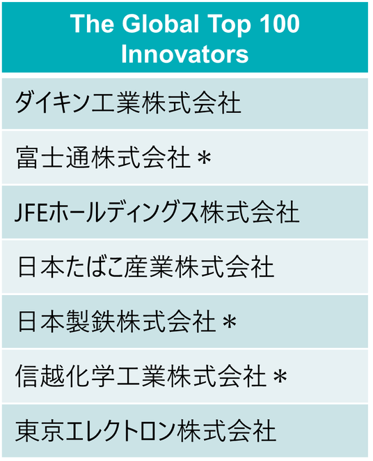 日本からは7社がTop 100に選出されました。このうち、富士通、日本製鉄、信越化学工業は本年初選出です。今回選出された日本企業は、半導体製造装置・材料、先端材料、空調、消費財、エンジニアリング、デジタルと幅広い領域にわたり、Innovation Momentumがコア技術やヘルスケアだけでなく、産業・応用領域へ広がっていることを象徴しています。
