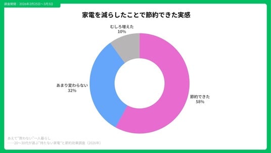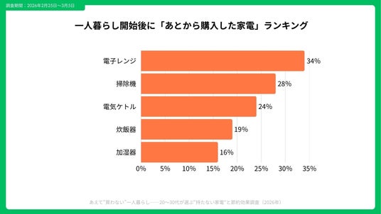 Song合同会社は、初めての一人暮らしを開始した、または開始予定の20~30代男女を対象に「持たない家電と節約効果」に関する調査を実施しました。 一人暮らし開始時に買わなかった家電、その理由、実際に生活してから感じた不便さや節約効果などを調査しています。