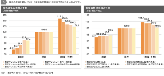 - 販売価格の実績と予想について、マンション市場・戸建て市場のいずれでも、販売価格が高いほど上昇率が高い傾向が生じている。