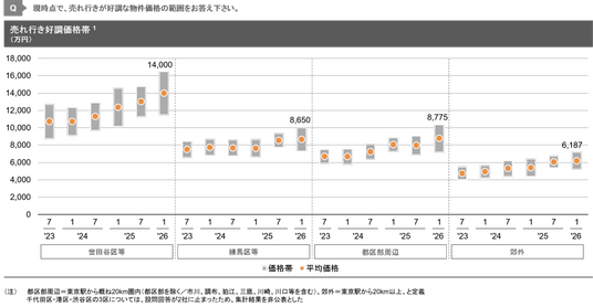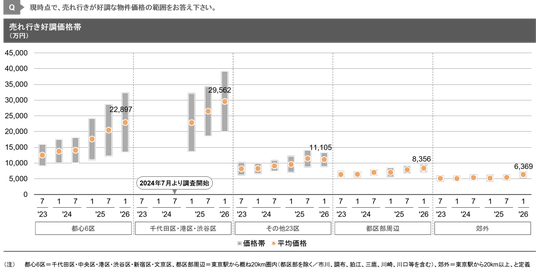 - 売れ行き好調価格帯について、マンション市場では東京23区(都心6区を除く)にて平均値の低下が確認されている。