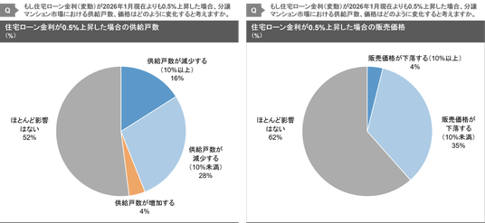 - マンション市場での住宅ローン金利が上昇した場合(+0.5%)の市況影響については、供給戸数では「供給戸数が減少する(10%以上)」、「供給戸数が減少する(10%未満)」がそれぞれ16%、28%、販売価格では「販売価格が下落する(10%以上)」、「販売価格が下落する(10%未満)」がそれぞれ4%、35%となった。