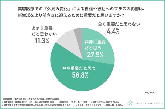 最後に、全員に「美容医療での『外見の変化』による自信や行動へのプラスの影響は、新生活をより前向きに迎えるために重要だと思うか」と尋ねたところ、約8割が『非常に重要だと思う(27.5%)』『やや重要だと思う(56.8%)』と回答しました。