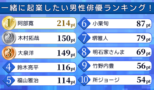 今回は、目標達成に向けた強い精神力や行動力が求められる『起業』において「この人となら一緒に起業してみたい」と思われている男性俳優を調査。