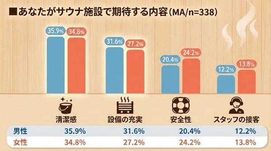 サウナ施設利用者が最も期待している内容が、男女ともに清潔感 (男性35.9%、女性34.8%) で、次いで設備の充実、安全性と、スタッフの接客 (ソフト) 面よりも、設備 (ハード) 面の方で期待しているユーザーが多いことがわかりました。その中でも男性の方が 「清潔感」 を期待している方が多い結果となりました。