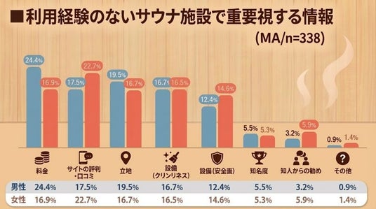 利用経験のないサウナ施設を初めて利用する場合、利用するにあたり重要視する情報は性別により差が出る結果となりました。男性では、「料金 (24.4%) 」 が最も多く、次いで 「立地 (19.5%) 」 が多い結果。一方、女性では 「サイトの評価・口コミ (22.7%) 」 が最も多い結果となりました。