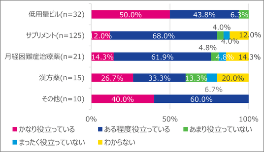 月経に関連する症状の軽減を目的とした日常的なケアについては、「低用量ピルの服用(10%)」、「サプリメントの服用(8%)」、「月経困難症治療薬の服用(7%)」、「漢方薬の服用(5%)」という回答が得られたのに対し、72%は「特に対処していない」と回答しました 【Q9】(図3)。日常的なケアを行う人に対し、そのケアが症状の軽減にどの程度役立っているかを聞いたところ、「かなり役立っている」「ある程度役立っている」と答えた人は、低用量ピル*で94%、サプリメントで80%、月経困難症治療薬*で76%、漢方薬で60%でした【Q11】(図4)。