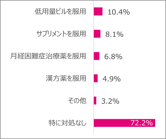 症状がつらい時に行っている対処では、「痛み止めの頓服(51%)」、「身体を温める・リラックスする(18%)」という対処が中心で、症状発現時も、40%は「特に対処していない」と回答しました【Q10】。