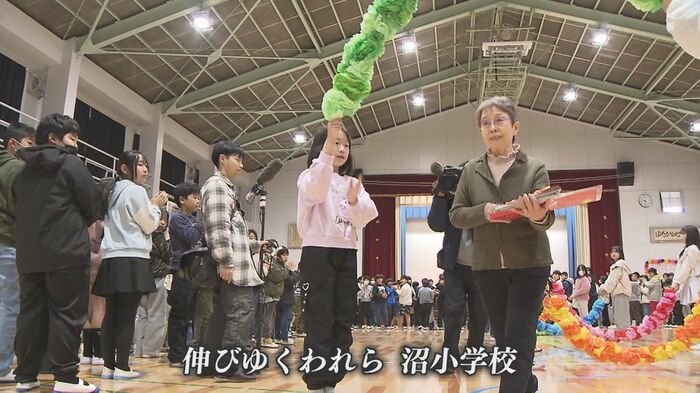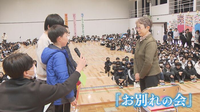 各学年の代表がメッセージカードを渡し、それぞれが感謝の言葉を告げた。そして校歌を斉唱して別れを惜しんだ。