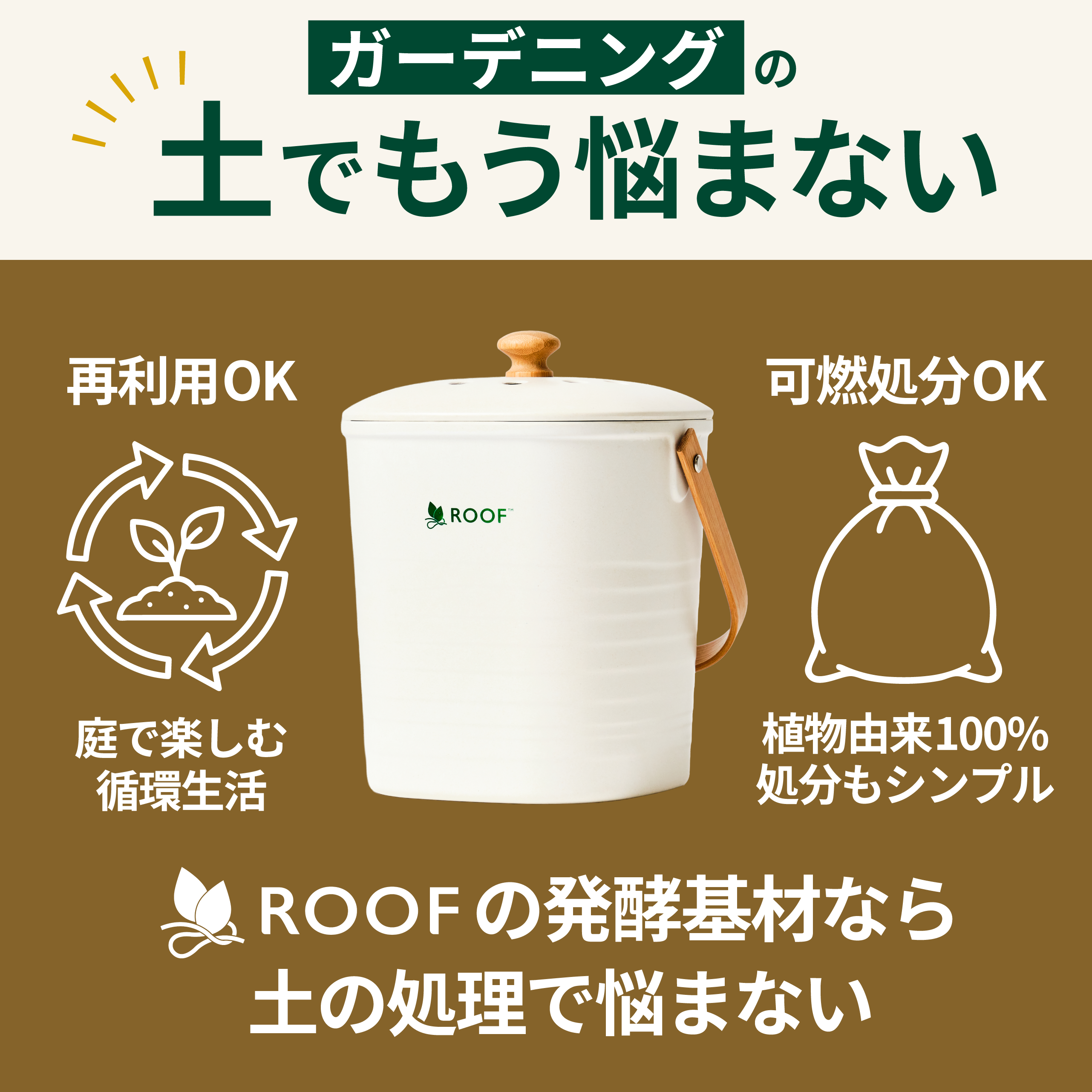 ROOFは、単に「生ごみを減らすコンポスト」「園芸用品」という商品に収まらず、土を通して他者とのコミュニケーションを生み出し、生き方を豊かにするアイテムです。自信をもって皆さまにお届けしていきます。