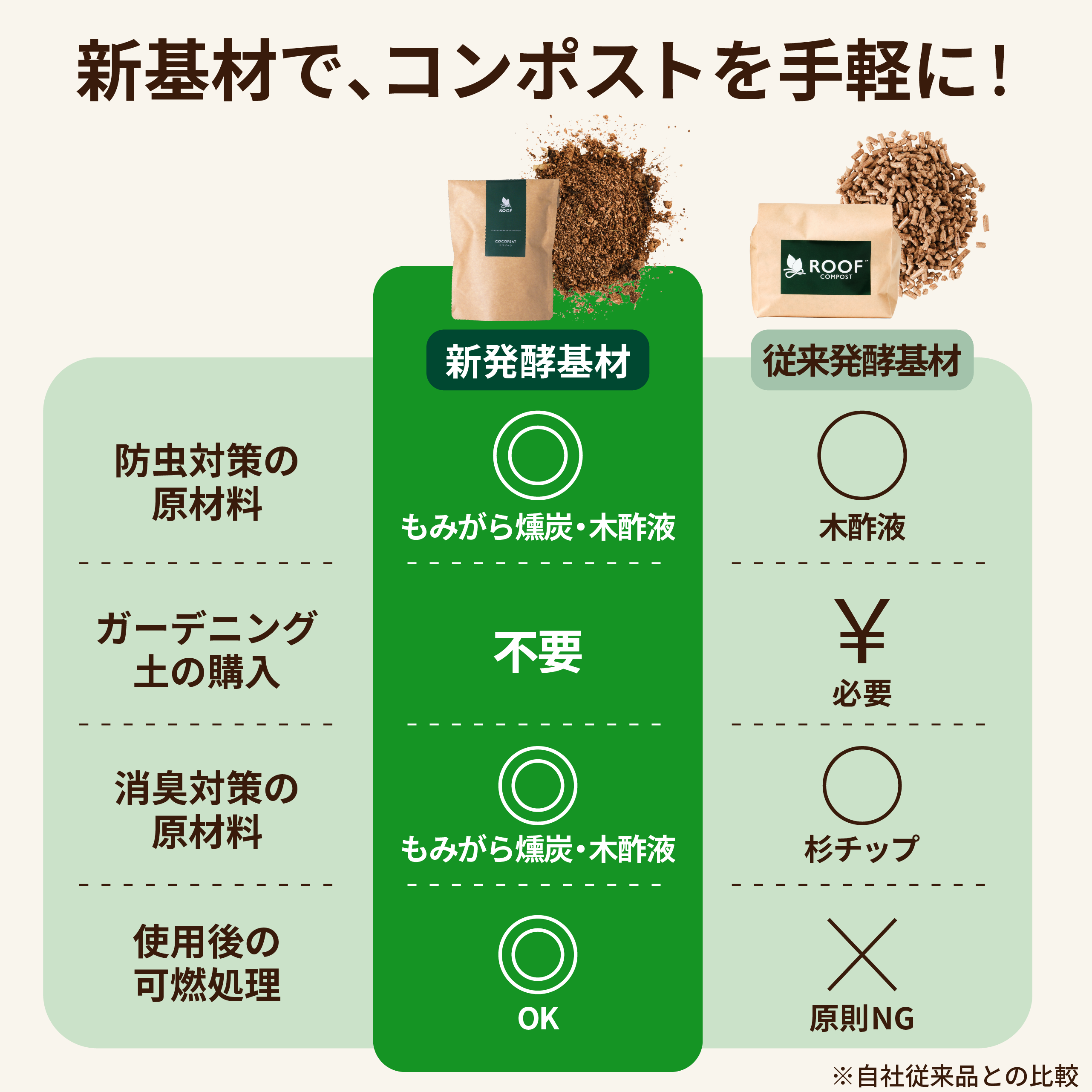 今回の商品リニューアルでは、ココヤシ殻(ココピート)を」中心に独自の配合によって開発した新しい基材をお届けします。マンションや住宅街で、より手軽で、楽しく、使いやすくなるよう開発を進めてきました。