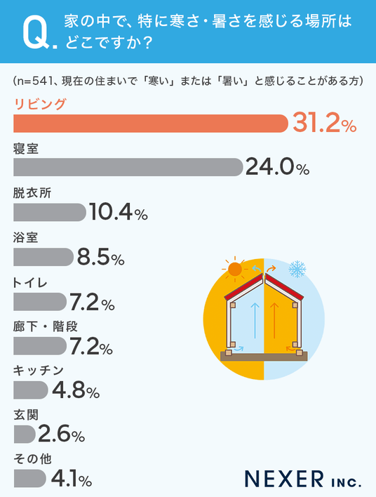 最も多かったのは「リビング」で31.2%、次いで「寝室」が24.0%、「脱衣所」が10.4%という結果になりました。長時間過ごすことの多いリビングや寝室、そして入浴前後に裸になる脱衣所で、温度のストレスを感じている方が多いことがうかがえます。