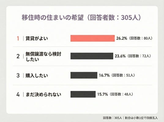 所有よりも、まずは負担を抑えて試したいという志向が見える一方で、購入を選ぶ人も一定数おり、移住の温度感やライフプランによって選好が分かれていることがうかがえます。