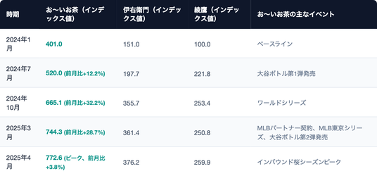 - 2025年3月のMLB東京シリーズ時は、北米や韓国、台湾からの訪日客比率が高まった可能性があります。これらの国は野球人気が高く、大谷選手の知名度も高いことから、「お~いお茶」が単なる緑茶ではなく「大谷グッズ」として手に取られた可能性があります。
