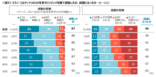 オリンピックを観た人で「感動した」と回答した人は87%と多数を占めた。家族や知人などの間で「話題になった」と回答したのは49%。感動・話題のいずれも年代が上がるほど高い割合となった。<図3>