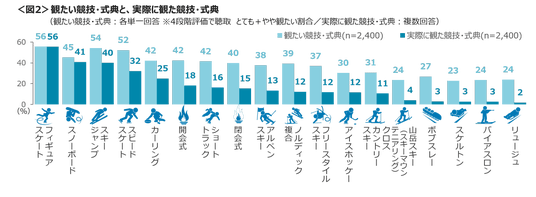 観戦した競技別では「フィギュアスケート」56%、「スノーボード」41%、「スキージャンプ」40%が高かった。開幕直前の観たい競技で4番手だった「スノーボード」の観戦経験は2番手にアップした。<図2>