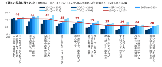 閉幕後に印象に残ったことは、「日本が過去最多のメダル数を獲得した」「メダルを取った時の選手の喜びや涙」「10代やオリンピック初出場の選手の活躍」が4割台、「選手のテクニックのすごさ」「競技終了後、選手同士が称えあう姿」が3割台と続いた。「日本が過去最多のメダル数を獲得した」「長く競技を続けているベテラン選手の奮闘」は、どの年代も一定数の割合があり、年代による差は見られなかった。<図4>