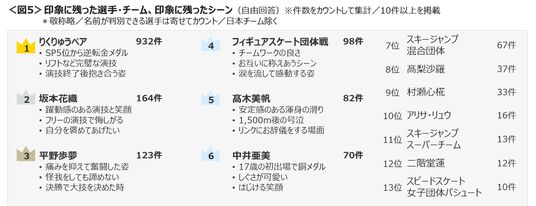 印象に残った選手・チームは、フィギュアスケートペアで逆転金メダルを獲得したりくりゅうペアが断トツ。次いで、坂本花織、平野歩夢、フィギュアスケート団体戦、高木美帆、中井亜美が上位にあがった。<図5>