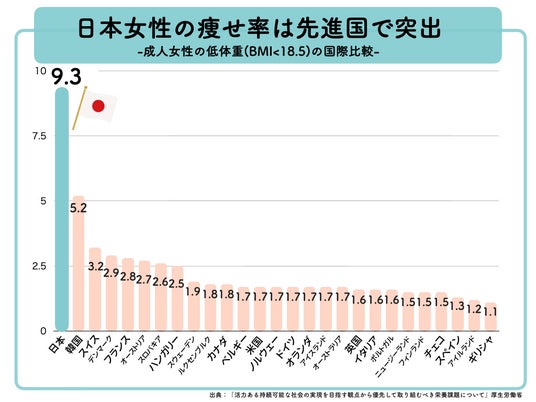厚生労働省「国民健康・栄養調査」によると、日本では 20~30代女性の20.2%がBMI18.5未満の「やせ」 に該当し、過去10年で最高水準となっています。これは一部の開発途上国と同程度であり、先進国としては極めて高い割合です。ラブテリはこれまでの研究により、女性の社会進出と健康課題の関係について分析を行い、発表してきました。