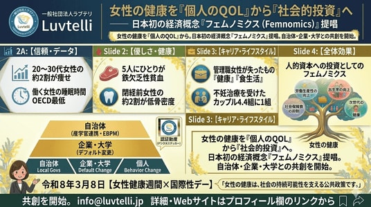 一般社団法人ラブテリ(代表理事:細川モモ)は、日本社会が抱える少子化、生産性低迷、離職増加、医療・介護費増大といった構造課題の根底には、女性の健康状態が横断的に影響していると捉えています。こうした背景を踏まえ、女性の健康を「社会的投資」と再定義する新概念「フェムノミクス(Femnomics)(TM)」を提唱いたします。