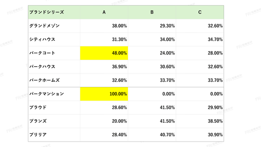 中でも、パークマンションは全住戸がA評価(20%以上のプレミアム)となり、100%が明確な超過価値を維持している点が特筆されます。また、パークコートについてもA評価の割合が著しく高く、上位ブランドとしての安定した価格支配力が確認されました。