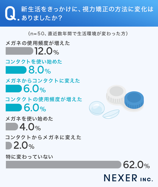 内訳を見ると「コンタクトを使い始めた」が8.0%、「メガネからコンタクトに変えた」と「コンタクトの使用頻度が増えた」がそれぞれ6.0%と、コンタクトレンズに関わる変化が上位を占めています。