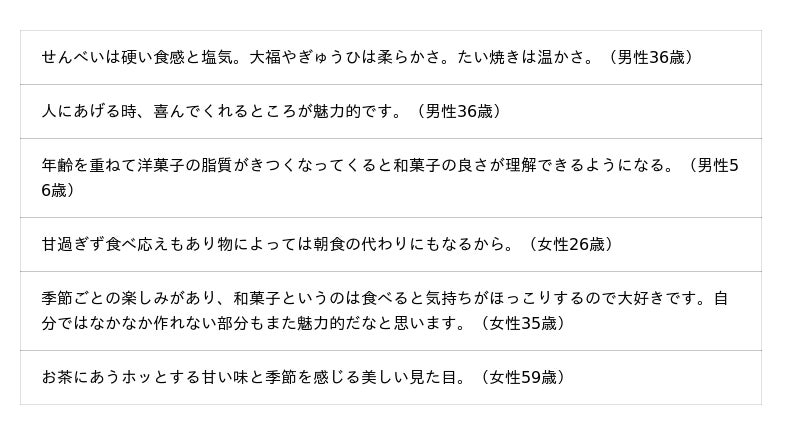 和菓子の喫食状況や意向、イメージなどについて聞いています。調査結果をお知らせいたします。
