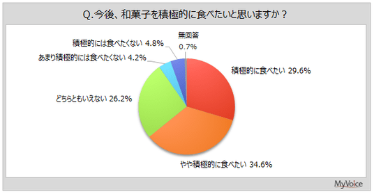 今後、和菓子を積極的に食べたいと思っている人は、「積極的に食べたい」「やや積極的に食べたい」を合わせて約64%です。