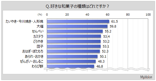 好きな和菓子の種類は(複数回答)、「たいやき・今川焼き・人形焼」が61.5%、「大福」が59.8%、「せんべい」が55.2%です。東北では「ゆべし」、近畿では「わらび餅」、九州では「かるかん」の比率が高くなっています。