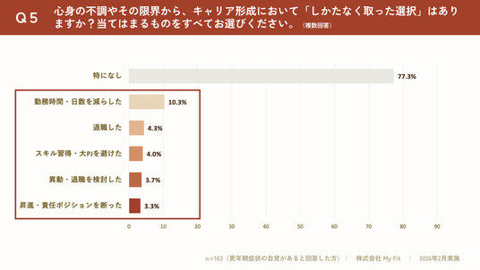 不調を感じている人の約30%(29.5%)が「パフォーマンスが50%以下になった」と回答。また、キャリアにおいて「しかたなく取った選択」がある人は全体の22.7%に達し、その理由として「自分の能力低下を感じる(51.5%)」のほか、「職場の制度や理解が不十分(25.0%)」といった環境要因も大きな壁となっています。