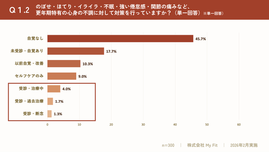 株式会社My Fit(本社:東京都中央区、代表取締役:山田真愛、以下「当社」)は、2026年3月8日の「国際女性デー」に向け、40代~50代の働く女性300名を対象に「働く女性の更年期に関する意識調査」を実施いたしました。