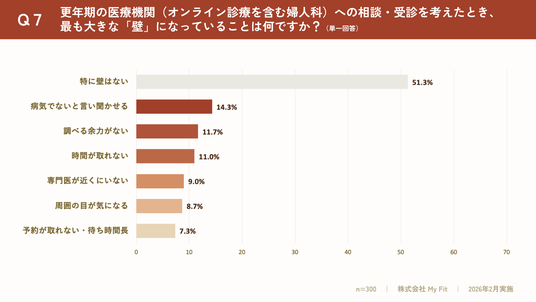 受診の壁として、「更年期症状は病気ではないと言い聞かせてしまう(14.3%)」といった意識の問題が挙げられました。背景には、日本における更年期障害を熟知した医師が少ないことにあります。女性ヘルスケア専門医は医師全体の約0.4%しか存在せず、適切な医療にアクセスしにくいという構造的な課題があります。