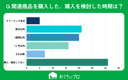 - エアコンクリーニングの関連商品を購入した時期は作業から「数日以内」から「1ヶ月以内」に集中している。