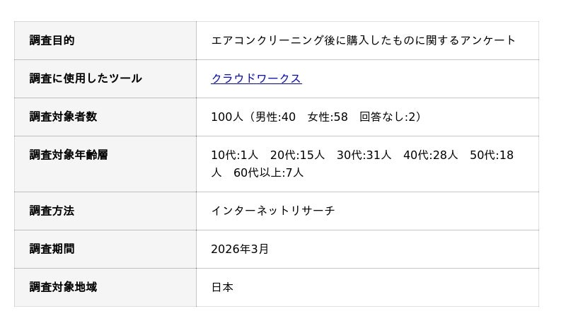 おうちにプロでは、エアコンクリーニングでお悩みの方により有益な情報を提供するために、「エアコンクリーニング後に購入したものに関する独自調査」を実施しました。アンケート調査の概要は以下の通りです。