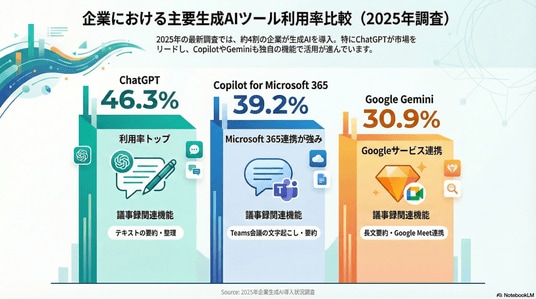 今回の調査から、AI議事録・要約ツールは「使える企業」と「まだ使えていない企業」の二極化が鮮明になっています。特に注目すべきは、Copilot for M365のように既存のワークフロー(Teams・Microsoft 365)と統合できるツールの普及速度が際立って速い点です。これは「新たなツールを覚える」コストを最小化できる設計が、組織への定着を大きく左右することを示唆しています。