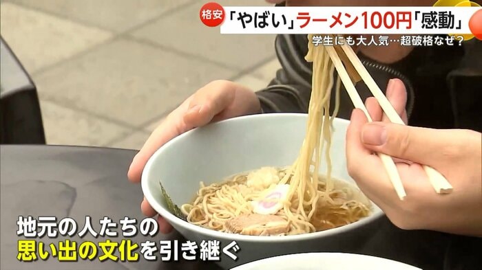 こちらの店は、かつて100円でラーメンを楽しめた地元の人たちにとって思い出の店の文化を引き継ぎ、当時と同じ100円でラーメンを提供している。