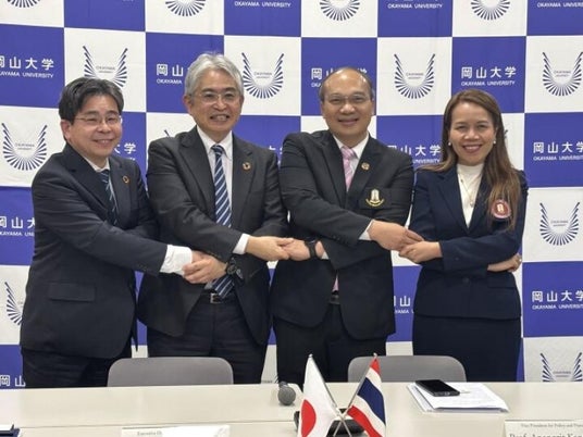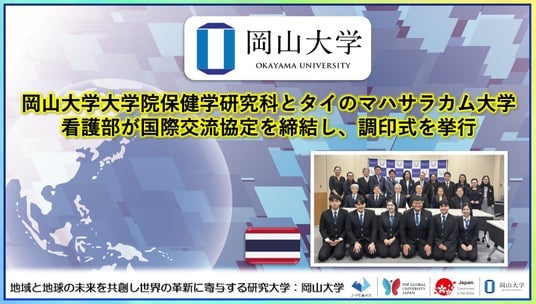 国立大学法人岡山大学(本部:岡山市北区、学長:那須保友)は、2026年2月17日、本学津島キャンパスにおいて、本学大学院保健学研究科とタイのマハサラカム大学看護部の国際交流協定(部局間)の調印式を執り行いました。