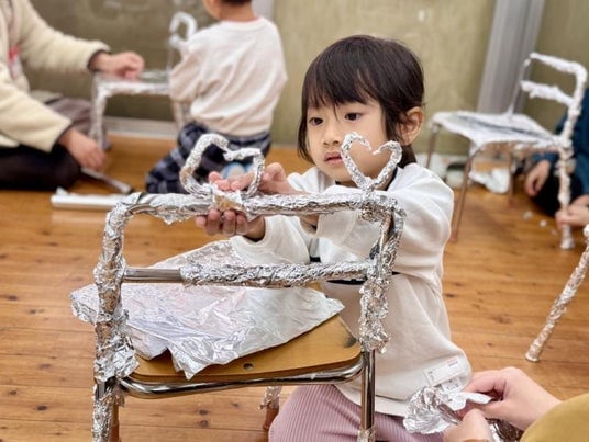 今回実施したのは、園児がいつも使っているイスや、自分のカバン、教室の壁、床などをアルミホイルで覆い、キラキラに変えていくというプロジェクト。清田教授による説明を、園児たちはワクワクした表情で聞き入り、まずは自分のイスをキラキラにすることからスタートしました。