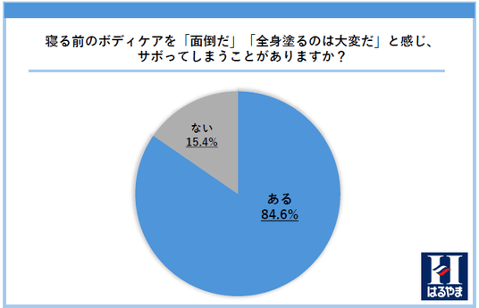 ・日々のボディケアの実態について調査したところ、8割以上(84.6%)が「面倒だ」「全身塗るのは大変だ」と感じてサボってしまうことがあると回答し、セルフケアを完璧に継続することの難しさが浮き彫りになりました。
