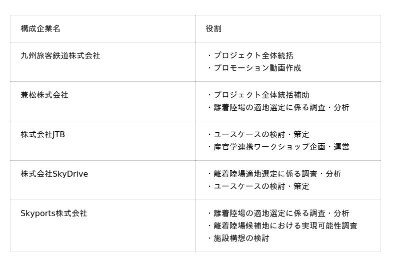 九州旅客鉄道株式会社(本社:福岡県福岡市、代表取締役社長執行役員:古宮洋二、以下「JR九州」)、兼松株式会社(本社:東京都千代田区、代表取締役社長:宮部佳也、以下「兼松」)、株式会社JTB(本社:東京都品川区、代表取締役 社長執行役員:山北栄二郎、以下「JTB」)、株式会社SkyDrive(本社:愛知県豊田市、代表取締役CEO:福澤知浩、以下「SkyDrive」)、Skyports株式会社(本社:東京都港区、日本代表:樽田匡史 、以下「Skyports」)は、大分県内における「空飛ぶクルマ」(※1)の社会実装プロセスの検討調査の最終報告をまとめ、2026年2月21日に大分県別府市内で実施したシンポジウムにて発表しました。