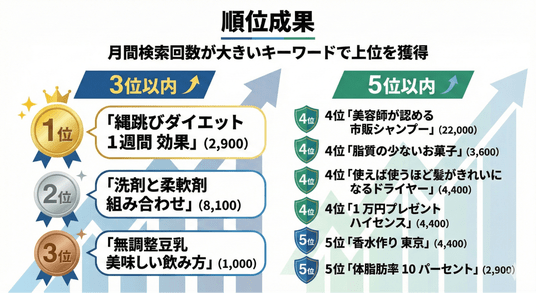 - 主要キーワードでの成果:「美容師が認める 市販シャンプー」「洗剤と柔軟剤 組み合わせ」といった、競合の多い主要キーワードにおいて検索順位トップ5入りを達成。